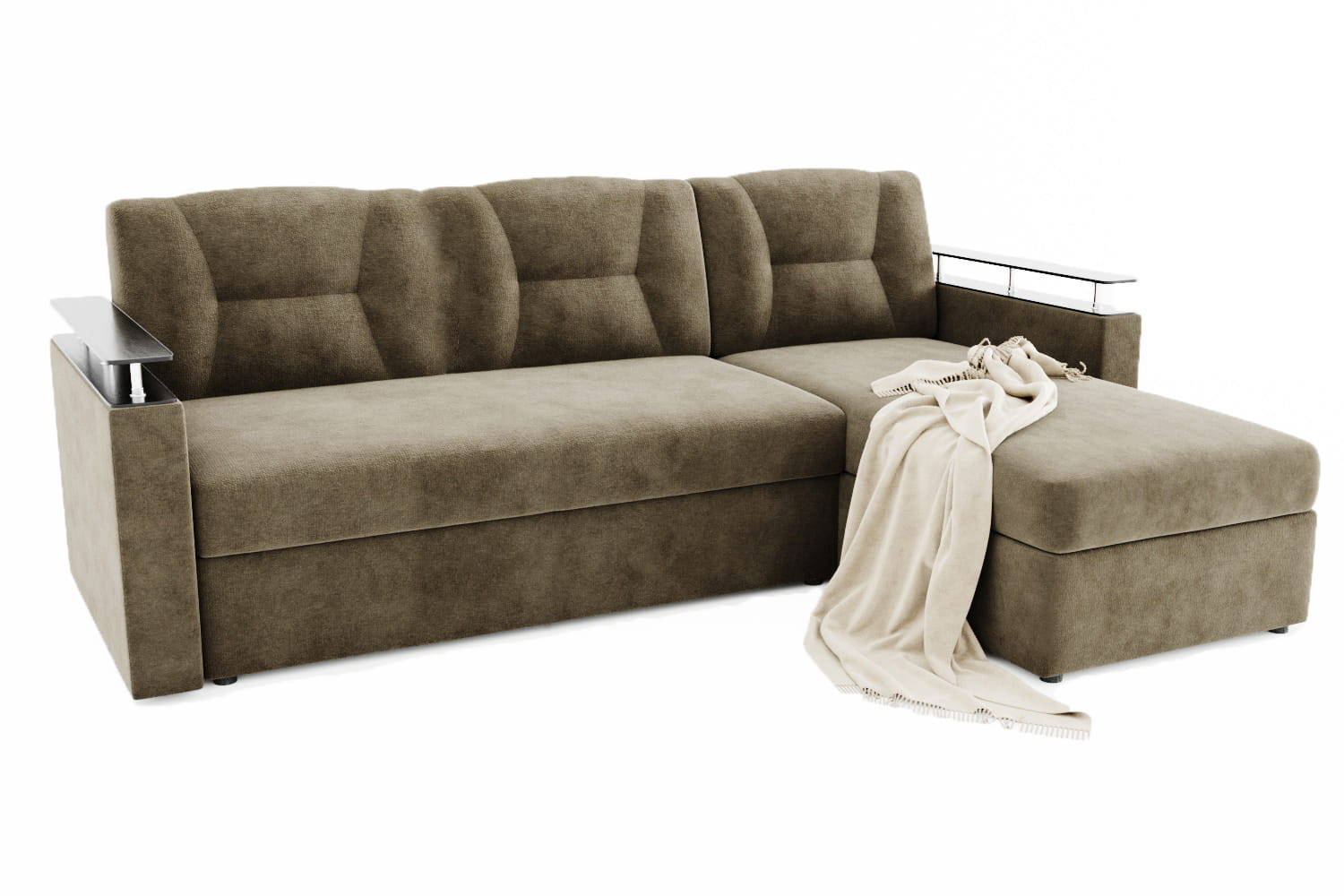 Особенности дивана: Изысканный и стильный трансформер для оригинальных дизайнерских решений. Практичный и вместительный: имеет большой ящик для белья, удобную оттоманку и просторное спальное место. Поможет выгодно зонировать пространство за счёт угловой модели. Толщина ППУ - 100 мм. Глубина сидения: 63 см. Доставляется в разобранном виде: локти, оттоманка, диван. Сзади дивана техническая ткань. Локти к дивану цепляются на салазках.